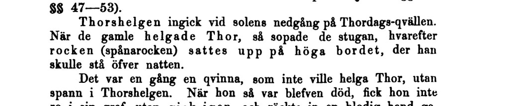 A notable belief is the holding of thursday evening as holy, being called Thorshelg — meaning Thor’s holy day. There were many practices and taboos which persisted around the holy day. Many of these have sabbath-like customs of not working and prohibitions against certain actions.