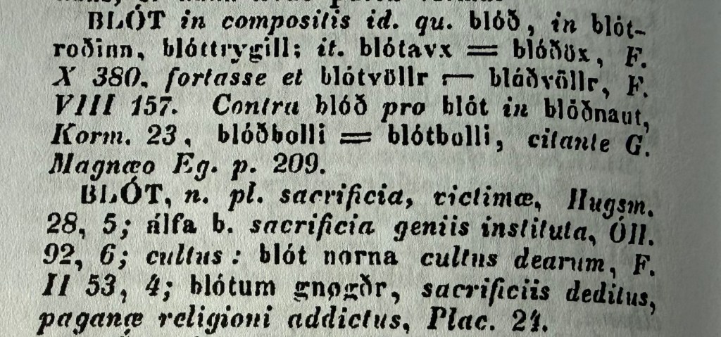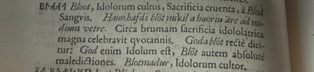 Specimen Lexici Runici is the first dictionary of Old Norse or Old Icelandic, being compiled by Magnús Ólafsson of Laufás in 1650. We can see here that the term blót even at a late stage, was distinctly associated with blood (à Blod sanguis) and blood sacrifice (sacrificia cruenta).